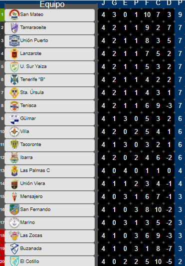 En lo estrictamente deportivo, el gran protagonismo en la cuarta jornada se lo lleva el debutante Atlético Tacoronte, que fue capaz de conquistar el feudo del mencionado equipo rojo (1-2). De este modo, logra su primera victoria en la categoría gracias a un doblete de Semidán, dando así un salto hasta la undécima posición dada su imbatibilidad hasta la fecha. El San Mateo, por su parte, sigue siendo líder, pero ya sin la condición de invicto tras caer 3-1 ante el Unión Sur Yaiza.