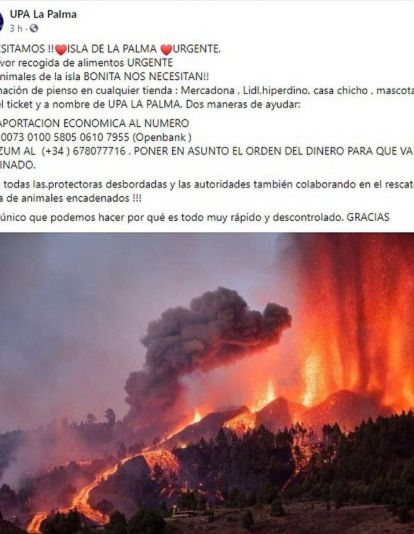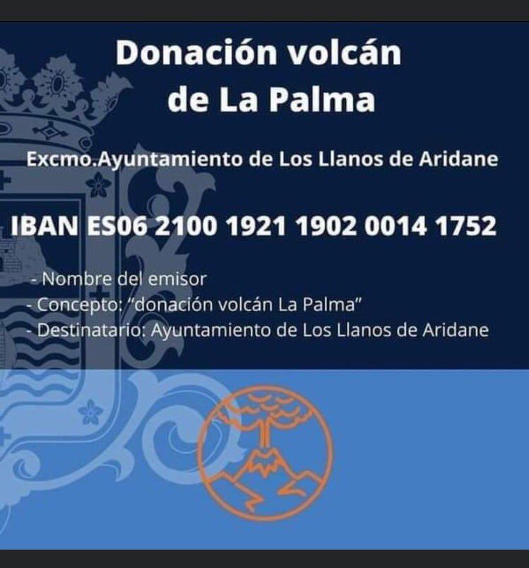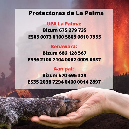Tras la complicada situación que en estos momentos están viviendo miles de persona en La Palma, la solidaridad canaria no se ha hecho esperar y numerosas asociaciones y organizaciones ya han organizado diferentes formas de ayudar a todas las personas y animales afectados. Desde cuentas bancarias a las que aportar donaciones, hasta todo lo necesario para el cuidado de los animales rescatados, la ayuda a La Palma puede ofrecerse de diferentes formas.El Ayuntamiento de Los Llanos de Aridane ha sido uno de los primeros en habilitar una cuenta bancaria para quien quiera realizar aportaciones en solidaridad con los afectados. La cuenta la abrieron en relación al gran número de personas que contactaron con el consistorio para ofrecer ayuda económica.Los interesados podrán enviar donaciones al número IBAN ES06 2100 1921 1902 0014 1752, indicando el nombre del emisor, con el concepto: “donación volcán La Palma” y destinatario: Ayuntamiento de Los Llanos de Aridane.El Cabildo de La Palma es otra de las instituciones que han abierto una cuenta bancaria para quien quiera realizar donaciones. Quien quiera colaborar puede hacerlo a través de Bizum con el código 03747, o a la cuenta bancaria ES47 2100 9169 0122 0017 9456 con el concepto 'Donación Volcán'.