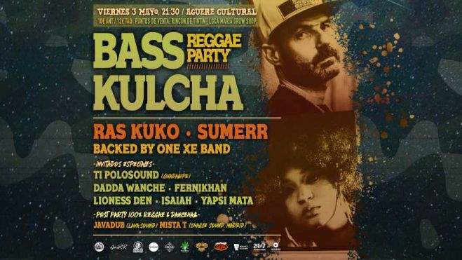 Una gran fiesta con el reggae como protagonista, eso es lo que propone Bass Kulcha Reggae Party para el próximo viernes 3 de mayo en el Espacio Cultural Aguere con las actuaciones de Ras Kuko y SumeRR, que estarán respaldados por la One Xe Band y acompañados por invitados especiales como Ti Polosound desde Guadalupe y los representantes locales Dadda Wanche, Isaiah, Lioness Den, Fernikhan y Yapsi Mata. Para culminar la noche, Javadub desde Lava Sound y Mista T desde Chalice Sound (Madrid), llenarán el hall del Aguere de Reggae y Dancehall con sus sesiones.