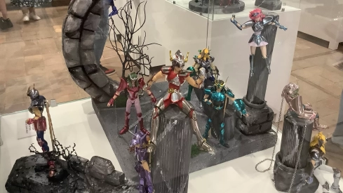 La muestra, que estará abierta al público durante dos semanas, está presidida por tres piezas de auténtico lujo: reproducciones a tamaño real de la armadura de oro de Sagitario y la primera armadura de Seiya. A ellas se suma el casco del caballero del Dragón, quizás la pieza más exacta y subjetivamente más especial de las que ahí se encontraban.