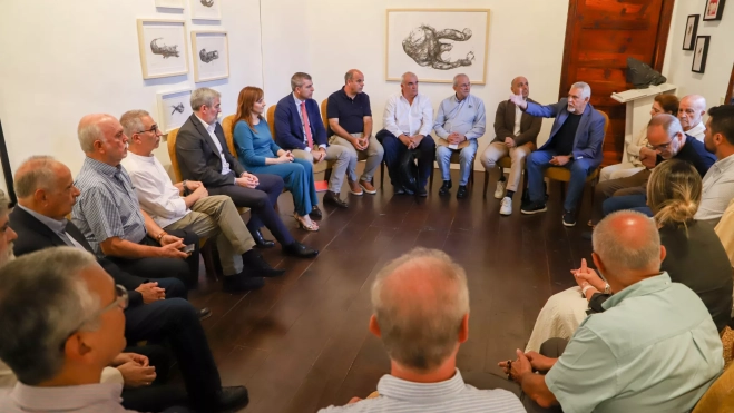Reunión del presidente de Canarias, Fernando Clavijo, el vicepresidente, Manuel Domínguez, y la consejera de Presidencia, Nieves Lady Barreto, con entidades socioculturales y civiles vinculadas a la Bajada de la Virgen de las Nieves 2025. / LUIS G. MORERA-EFE