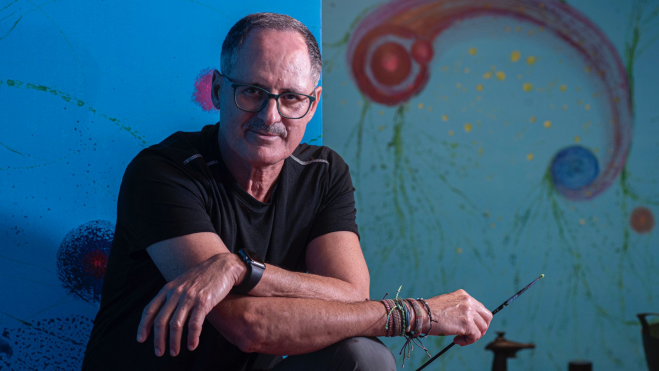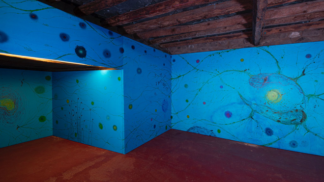 “Pretende ser una propuesta inmersiva, donde las redes neuronales y las conexiones entre raíces y microbiología del suelo nos hacen recrear ese mundo invisible a nuestros ojos”, desarrolla el artista. El proyecto está pensado para estimular los sentidos. Además de las formas y colores plasmados, la experiencia cuenta con la ayuda de difusores de aromas y con la importantísima colaboración del sonido a modo de banda sonora, a cargo del compositor Juanda Mendoza, que ha sabido poner sonido a esos sutiles pero constantes procesos vitales. “Una preciosa composición que logra hacernos sentir el flujo de la vida”, añade Guerra.