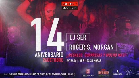 El próximo 26 de octubre el local de la Calle La Noria, Mojos y Mojitos, celebrará por todo lo alto la fiesta de celebración de su 14 aniversario. Para ello, este veterano y activo local santacrucero ha organizado una fiesta con numerosas sorpresas en las que además se podrá disfrutar de la sesiones de los dj Ser y Roger S Morgan. La cita dará comienzo a partir de las 23:30 horas, con entrada gratuita.