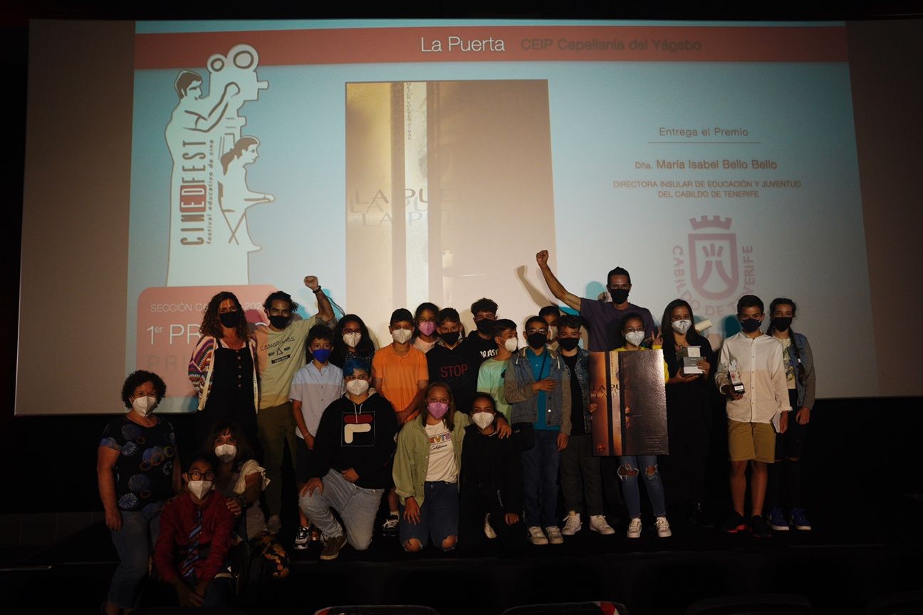 Los multicines Tenerife acogieron una gala presencial del festival Cinedfest 8, que este año sí contó con espectadores de carne y hueso, respetando todas las medidas sanitarias, para entregar los premios del curso cinematográfico 2020/2021 en la categoría de Primaria, que contó con 38 cortometrajes grabados por el alumnado canario.María Isabel Bello, directora insular de Educación y Juventud del Cabildo de Tenerife, fue la responsable de dar a conocer que “La puerta” es el trabajo más valorado por el jurado en la categoría de Primaria.“El cabildo apuesta por este festival porque despierta la imaginación del alumnado”, comentó. “La puerta”, del CEIP Capellanía del Yágabo (Lanzarote) gravita en torno a una puerta, que propicia saltos temporales. Imaginativa pieza visual.“Cinedfest es una pasada y animó a todo el mundo que participe en este festival formativo”, pronunció Alfonso López, docente del centro ganador. “Este festival es una oportunidad de desarrollar toda nuestra creatividad”, añadió una alumna. El centro lanzaroteño CEIP Capellanía del Yágabo también consiguió el premio al mejor cortometraje de terror: “El encargo”.La gala matutina, presentada por el periodista Miguel Ángel Rodríguez, comenzó a las 11:00 horas y se prolongó durante dos horas y media. Las intervenciones de alumnado, docentes y responsables de las instituciones se fueron sucediendo.“Felicito a todos los participantes por su creatividad y por sus valores. Hace falta más cine en las aulas. Hace falta más Cinedfest”, enunció Federico J. Delgado (director territorial de Tenerife de la consejería de Educación, Universidades, Cultura y Deportes del Gobierno de Canarias, al entregar el entorchado al Centro Educativo al CEIP Ernesto Castro Fariña (Tenerife).Olaia Morán Ramírez, consejera de Educación y Juventud del Cabildo de Gran Canaria, dio a conocer que “Ojo por ojo”, del CEIP Argana Alta (Lanzarote) obtuvo el premio a la mejor comedia. php/ver-cortos/cortos-2021/ item/la-puerta-2 php/ver-cortos/cortos-2021/ item/el-examen-2
