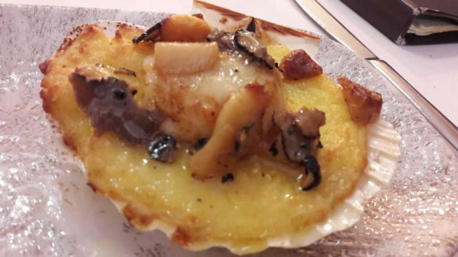 Me agradó especialmente esa vieira con puré de papa negra y trufa negra (foto de portada) que es cierto, en su extrema sencillez, que rompe con todas fórmulas habidas y por haber que se puedan desplegar con la carne de la concha universal y símbolo del Camino de Santiago.