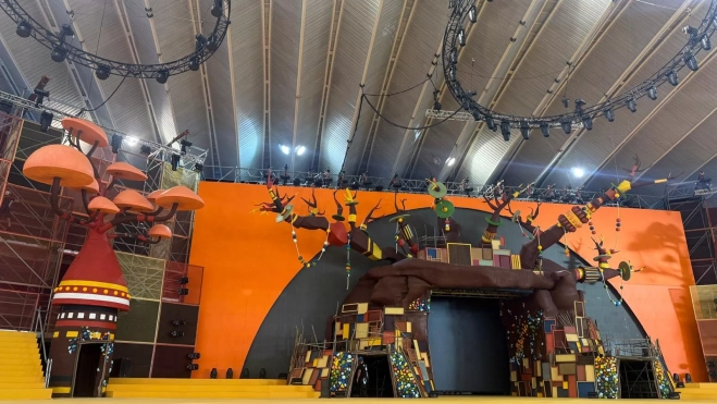 Las tonalidades naranjas con detalles minuciosos y coloridos inspirados en África marcan la estética del escenario junto a un gran árbol central que representa las raíces y la artesanía. Un espacio que terminará de destacar por completo con el juego de luces que lo acompaña.