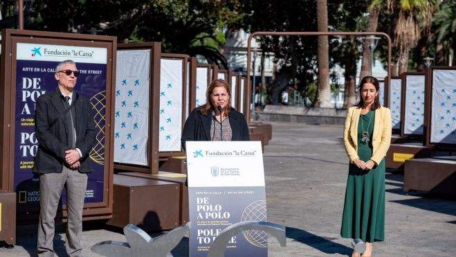 El jefe de servicio del Área de Cultura del Ayuntamiento de Las Palmas de Gran Canaria, Juan Espino; la responsable de Acción Social de CaixaBank en Canarias, Olga del Pino; y la delegada territorial de la Fundación “la Caixa” en Canarias, Yasmina Hormiga, han inaugurado hoy De Polo a Polo, un viaje a los grandes paraísos naturales.