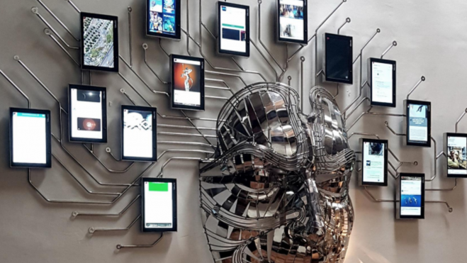 La obra central de la exposición, nacida durante la pandemia a raíz de la hiperconexión que trajo consigo, se estructura en varias pantallas conectadas a una gran cabeza de acero. Las pantallas se activan con el movimiento, partiendo de la idea que los propios móviles ya se encienden con el simple movimiento. En estas pantallas se pueden ver las diferentes aplicaciones que cualquier usuario suele consultar en su teléfono móvil, lo que provoca esa conexión de cotidianidad con el espectador.