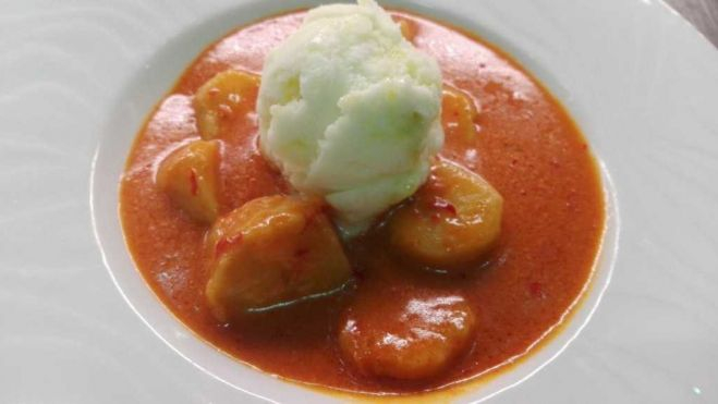 Aquí –y en Pekín, val decir- ese emplatado caliente, humeante, con ese “déjame entrar” para proporcionarnos esa placidez tan reconfortante: fideos con caballas, caldo de pescado resultante de la cazuela que, además del “tumbo” resultante de nuestro puchero, nos remite al fabuloso escaldón de gofio, en el que también el arte de la cuchara está presente acompañado de mojos o aceite y vinagre.