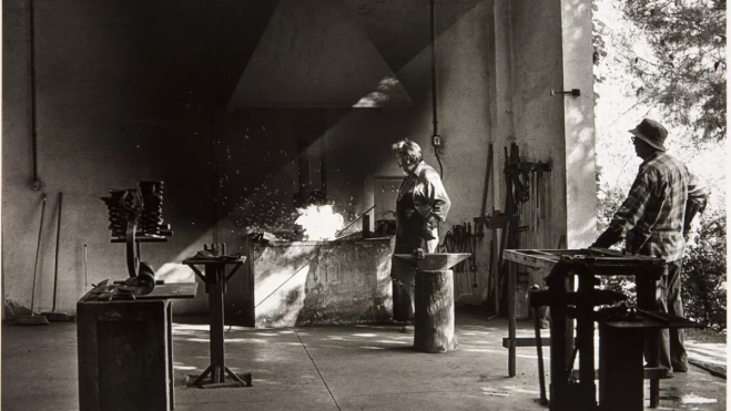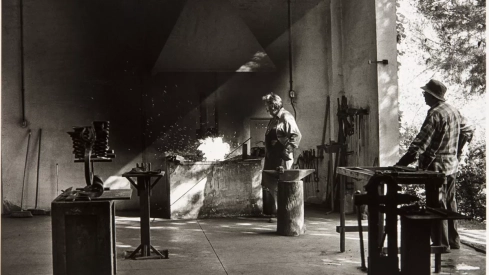 La selección de piezas incluye esculturas, dibujos y una fotografía icónica del artista en su taller: