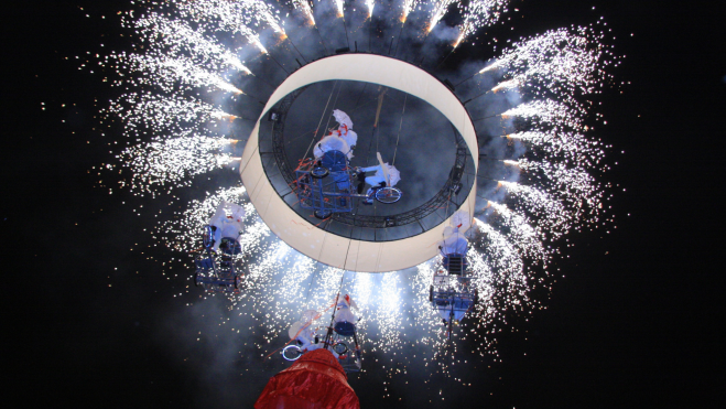 El encuentro de los amantes llega a su culminación cuando el amor les lleva hacia el cielo. Como en un cuento de hadas, los personajes vuelan hacia sus deseos, pedaleando en el cielo, mientras una gran pantalla gigante aérea circular muestra un hermoso vídeo de imágenes muy sugerentes. Un poema visual con coreografías y una ópera urbana con canto lírico en directo. Un espectáculo que ofrece esperanza y luz.