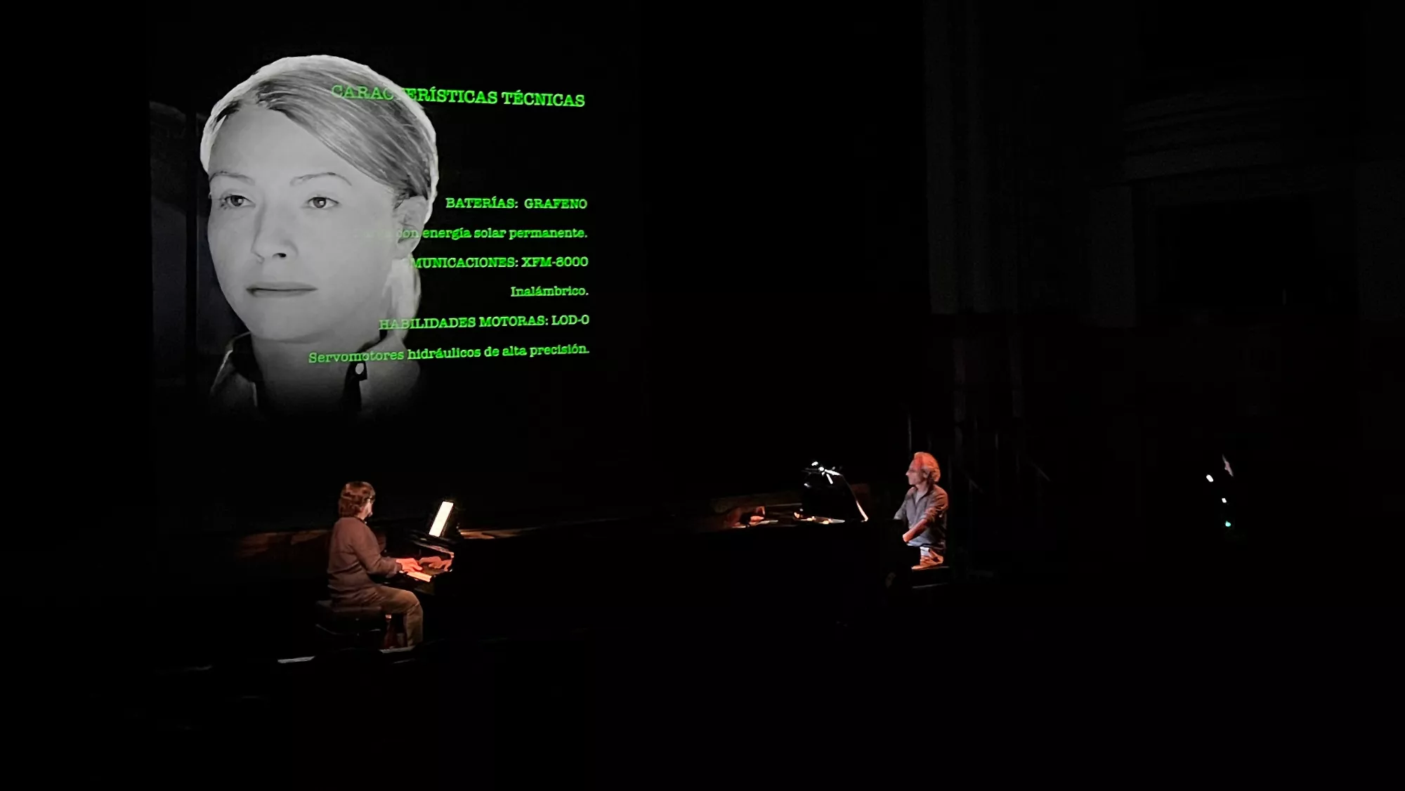 “El diálogo con el personaje es muy directo entre los dos pianos. Los instrumentos reflejan con la música los sentimientos que puede sentir el personaje. Al mismo tiempo, utilizamos una serie de proyecciones con las que va interactuando. Se crea un universo propio. Esa es la idea, todo es poético y aforístico. No hay una lucha entre el ser humano y la inteligencia artificial. No es una historia de buenos y malos”, expone Halffter.