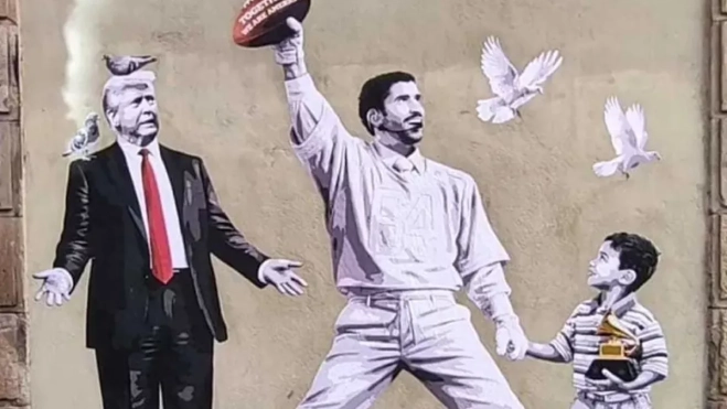Un grafiti del artista tinerfeño Alberto León en el centro de Barcelona reivindica la paz frente al presidente estadounidense Donald Trump, con una imagen del cantante puertorriqueño Bad Bunny en su espectáculo de la Super Bowl, de la mano de un niño detenido por la policía migratoria.