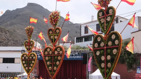 Las calles de la localidad tinerfeña de Tejina se han teñido este domingo de colores con la celebración del "Día de los Corazones", una fiesta tradicional en la que los vecinos, agrupados por barrios, compiten entre sí por elaborar unas estructuras formadas por flores y frutas que llegan a medir cerca de doce metros de largo y a pesar aproximadamente unos 100 kilos.