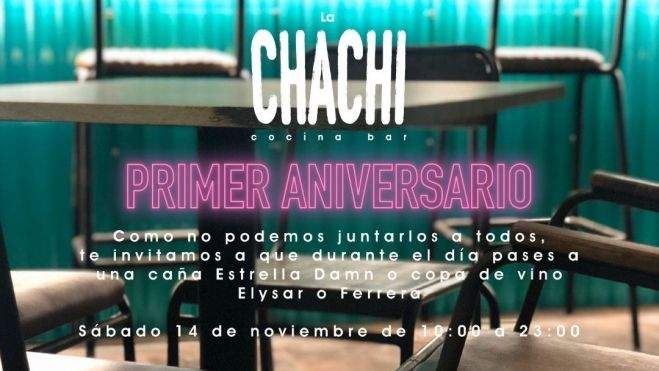 "Probablemente, si hubiéramos sabido que el 2020 fuese así, no nos habríamos embarcado en este proyecto en aquel momento, pero nunca hubiésemos dejado de hacerlo una vez recuperada la salud y economía del país y del planeta". Así reflexionan desde uno de los locales revelación del año en Santa Cruz de Tenerife, La Chachi. Esta casa de comidas del siglo XXI, de la mano del chef Javier Gutiérrez, cumple un año este sábado tras vivir un 2020 que ha cambiado la vida a todo el mundo y su forma de trabajar."Eso no quita que una vez que nos tocó, y tuvimos que superar la época de cierre y reinventarnos con take away y ayudando en los momentos más difíciles de la pandemia a militares, policías sanitarios y todo el que nos pidió ayuda, ya sabemos que esto será un proyecto de muy largo recorrido", añaden desde el establecimiento situado en la prolongación de la calle Ramón y Cajal, número 5.Para celebrar el este especial primer aniversario, La Chachi cocina bar les invita ofreciéndoles una caña de cerveza o una copa de vino Elysar del Hierro o Ferrera de Tenerife.No pierdas esta oportunidad y acércate para celebrar y felicitar a la nueva cocina creativa que llegó para conquistar el paladar de los tinerfeños.*Para cumplir con los protocolos es necesario que llamar para reservar tu hora de venida y controlar los aforos.¡Así que estás invitado! Llama antes al 922 281 685.¡Feliz Aniversario a la gente CHACHI!