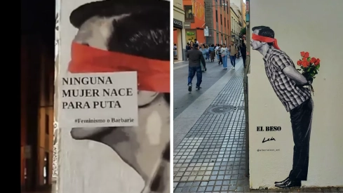 El colectivo Feministas Canarias, que se declara "abolicionista del género y de la explotación sexual y reproductiva", ha difundido este martes unas imágenes de una pegada de pegatinas que, al parecer, tuvo lugar la noche del lunes y en la que uno de los adhesivos acabó vandalizando el mural El Beso, que el artista tinerfeño Alberto León pintó en Santa Cruz después de haberlo hecho en enero en La Laguna para denunciar el beso no consentido de Rubiales a Jenni Hermoso.