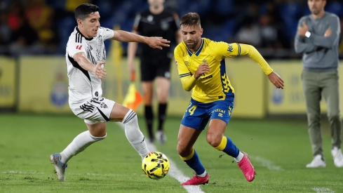 La respuesta amarilla fue mucho más eficaz. En un saque de esquina ejecutado en corto, Iván Gil amagó el envío y terminó colocando el balón al área pequeña, donde Manu Fuster apareció completamente libre para cabecear el 1-0. El exjugador del Albacete celebró con discreción e incluso pidió perdón a la afición visitante, un gesto que condensó la calma con la que Las Palmas manejó el resto del primer acto.