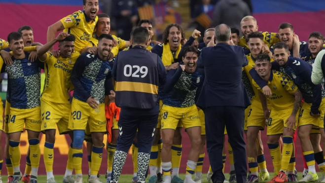 Los jugadores de Las Palmas celebran su victoria ante el Barcelona, tras el partido de LaLiga en el Estadio Olímpico Lluís Companys en Barcelona este sábado. / ENRIC FONTCUBERTA-EFE