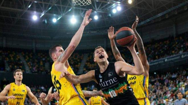 Jaime Fernández entró en escena con una gran asistencia para el desmarque de Abromaitis y luego llevó la ventaja aurinegra a los diez puntos desde el tiro libre. Adam Smith anotó un triple que le confirmó como la baza ofensiva más poderosa de los de Jaume Ponsarnau. Luego Bolmaro robó, arrancó y hundió el aro. Como siempre, también apareció Marcelinho, con canasta y asistencia a Fran Guerra. En solo el primer cuarto, los de Vidorreta ganaban por 17 puntos, con un 8-25.