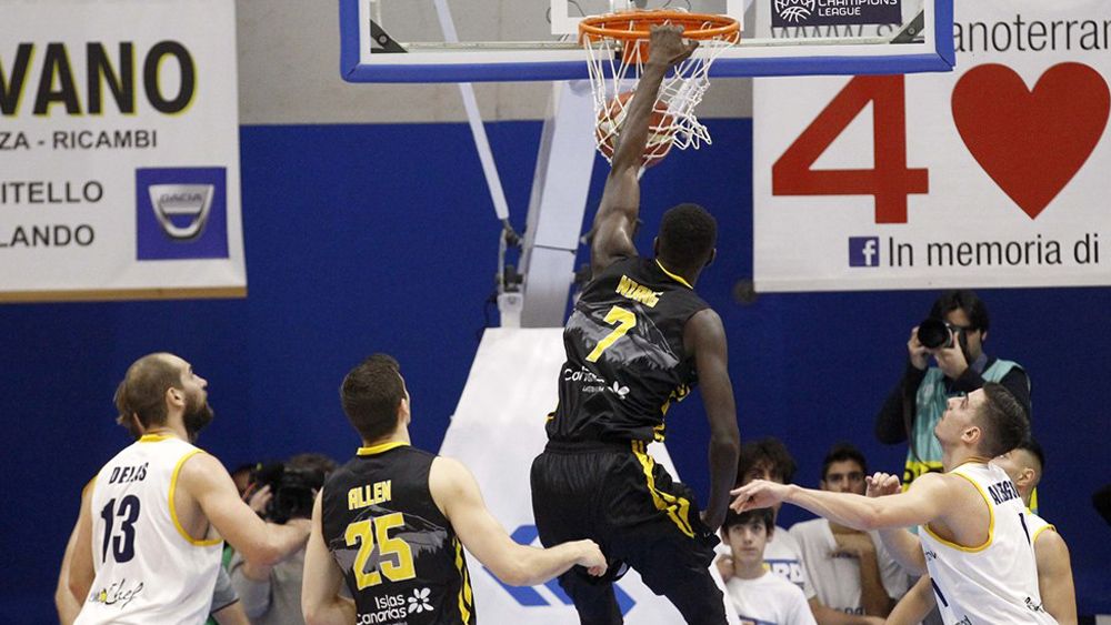 Niang machaca el aro ante la mirada de los rivales | @basketballCLEl paseo aurinegro por Sicilia acabó de forma placentera, sin que el cuadro local hiciera cosquillas a los de Katsikaris en ninguna faceta del juego. Así las cosas, el Iberostar Tenerife se mete por la puerta grande en la próxima fase, octavos de final. Que pase el siguiente.