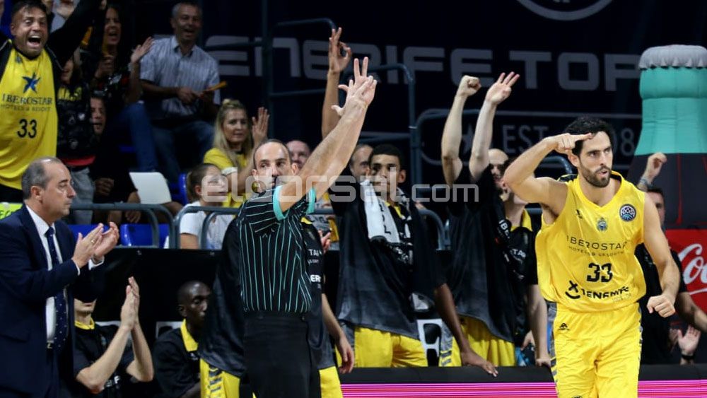 Javi Beirán celebra una canasta / @jacfotografoTxus Vidorreta apretó también desde el banquillo para que su equipo pasara a una defensa en toda la pista y ahogar al equipo alemán que se mantenía en partido gracias a su juego interior y en especial al jugador Charles Jackson. Una canasta de Tim Abromaitis puso el 13-5 en el luminoso y el conjunto aurinegro comenzaba a despegarse en el marcador. El equipo local se sentía muy cómodo, corriendo tras perdida del Telekom Bonn hizo daño y una canasta de Bassas en estas circunstancia provocó el tiempo muerto alemán con 26-11 en el marcador. Con 29-13 se cerró un primer cuarto donde el Iberostar Tenerife fue mejor que su rival en todos los aspectos del juego.