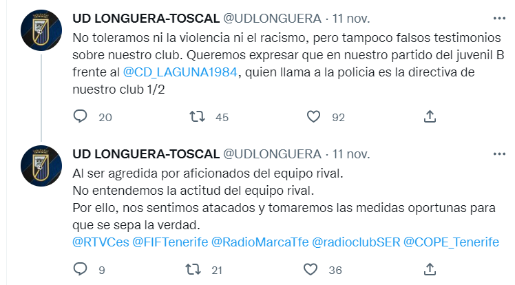 Según los comentarios de ambas publicaciones, la historia cambia. Los aficionados del Longuera dicen que fue una madre del Laguna la que comenzó los altercados con una agresión. Según la cuenta oficial del CD Laguna, sus jugadores tuvieron que salir escoltados por seis policías locales y seis dotaciones de la Policía Nacional.