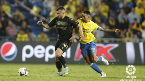 El derbi canario empezó con protagonismo de Las Palmas, que acaparó la posesión y en botas de Marc Cardona dispuso del primer disparo a puerta cuando apenas se habían cumplido cinco minutos. El asedio al área blanquiazul continuó sin tregua con una jugada de Moleiro que acabó en un disparo de Viera atajado por Soriano, además de un tiro de Pejiño desde la frontal del área que también tuvo que repeler el guardameta tinerfeñista. En ataque el Tenerife no mostraba síntomas de actividad más allá de las dos tarjetas amarillas que vieron Waldo y Gallego. Precisamente un lanzamiento desviado del ariete catalán sería a la postre el único disparo del Tenerife en la primera parte.