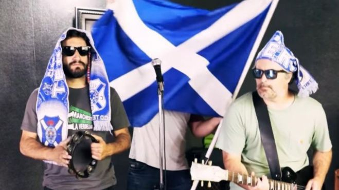 Amanhuy Calayanes, Diego Lupiáñez y Carlos Pedrós, ataviados con bufandas y bandera blanquiazules, hacen una performance con la letra modificada para animar al CD Tenerife en el trascendental partido de ida de este sábado, mientras Víctor Hubara, natural de Gran Canaria, cierra el vídeo a su manera vestido de la UD Las Palmas.