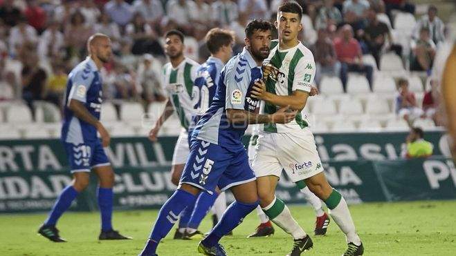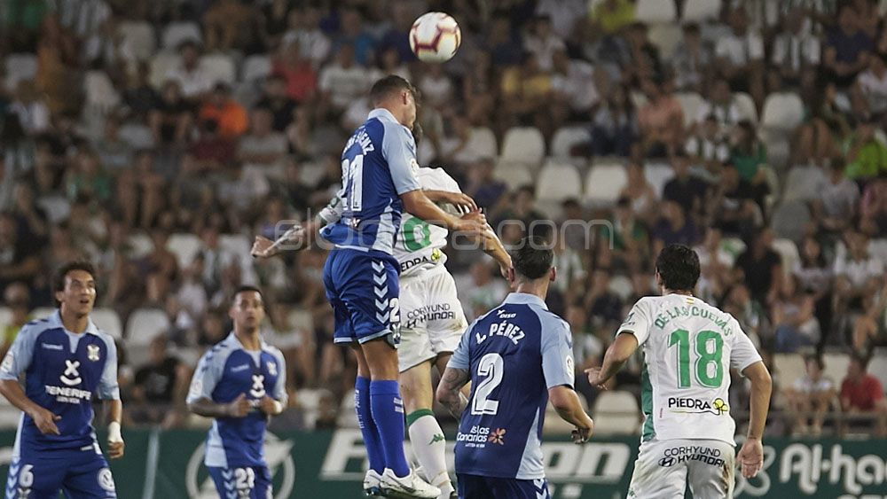 Jorge pugna con el delantero cordobésPese al dominio el Córdoba no creaba peligro ante la portería defendida por Dani Hernández. Sin ocasiones para ningún conjunto el encuentro parecía abocado a enfilar el túnel de vestuarios con el empate inicial, pero los blanquiazules se reencontraban con la suerte. Naranjo ejecutó con potencia una falta, que había provocado, y el esférico fue desviado por la barrera alejándose de los dominios del joven guardameta Alberto. El CD Tenerife se ponía por delante por primera vez esta temporada en partido oficial y volvían las sonrisas a los jugadores -y a la hinchada- tinerfeñista.