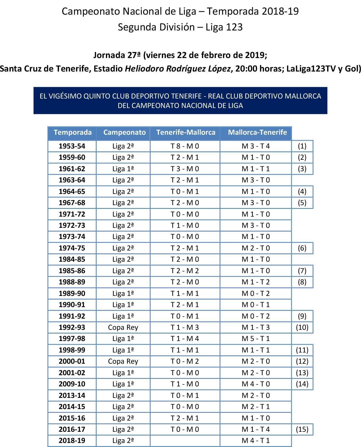 CD Tenerife y RCD Mallorca han pasado por épocas duras en la historia reciente, fuera del fútbol profesional incluso, y por ello solo se han enfrentado en el Heliodoro en cinco ocasiones en la última década, de la cual se rescata una única victoria bermellona pero también dos empates a cero. El equipo blanquiazul ha sido capaz de vencer en doce enfrentamientos en el recinto capitalino, pero solo registra dos triunfos en el período mencionado. El último, en la 15-16 con un marcador de 2-1 (goles de Cristo González y Omar Perdomo para los blanquiazules y Moutinho por los baleares).