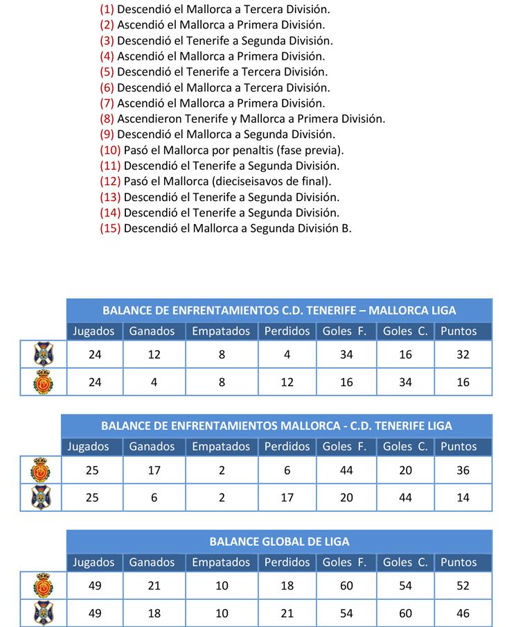 El CD Tenerife necesita imperiosamente el triunfo este viernes (20 hora canaria) ante un RCD Mallorca que no es precisamente una 'perita en dulce' cuando ejerce de visitante en el Heliodoro. Ha perdido en la mitad de sus visitas al feudo blanquiazul (12), pero ha sido capaz de llevarse el triunfo en cuatro ocasiones, la última por 0-1 (13-14), y entre todas las competiciones solo ha perdido dos partidos en el recinto capitalino en sus visitas en el siglo XXI.
