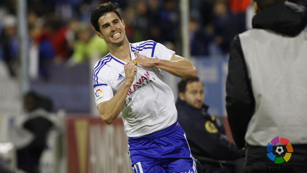 Edu García celebra un gol con el Zaragoza. | @laligaSIN EQUIPO DESDE JUNIO
