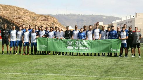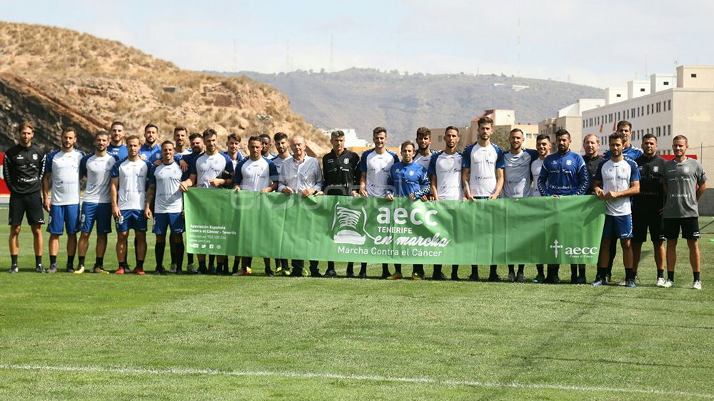 La plantilla y el cuerpo técnico del CD Tenerife recibieron este miércoles, a la finalización del entrenamiento en El Mundialito, a la Asociación Española Contra el Cáncer (AECC), en la figura del presidente de la Junta Provincial, Juan Julio Fernández, con motivo de la marcha solidaria que se organizará en La Laguna, el próximo domingo, día 22 de octubre: AECC La Laguna en Marcha.