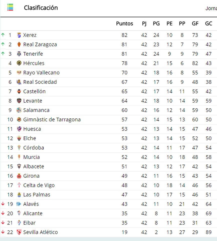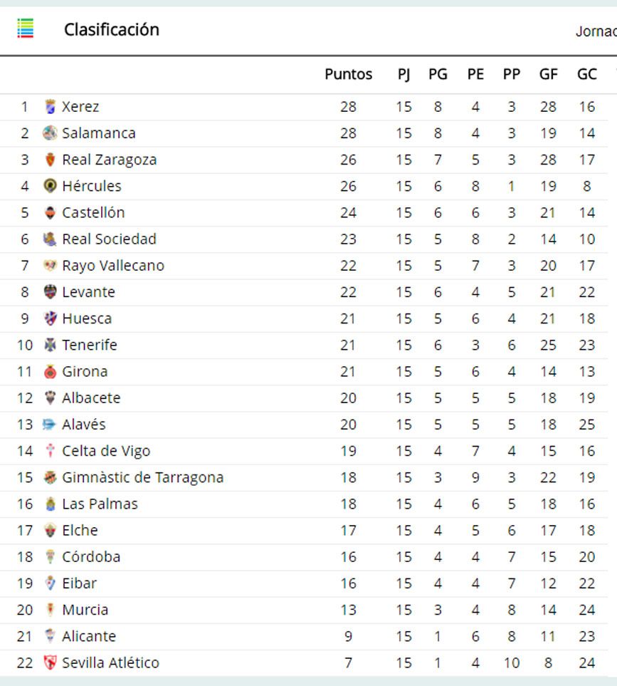 Clasificación de Segunda División en la jornada 15 de la campaña 08-09 | bdfutbol.comLo logró el CD Tenerife. Si en la jornada 15 tenía a Xerez y Zaragoza siete y cinco puntos por encima, respectivamente, al término de las 42 fechas acabó igualado a puntos con los maños y a solo uno de los andaluces.