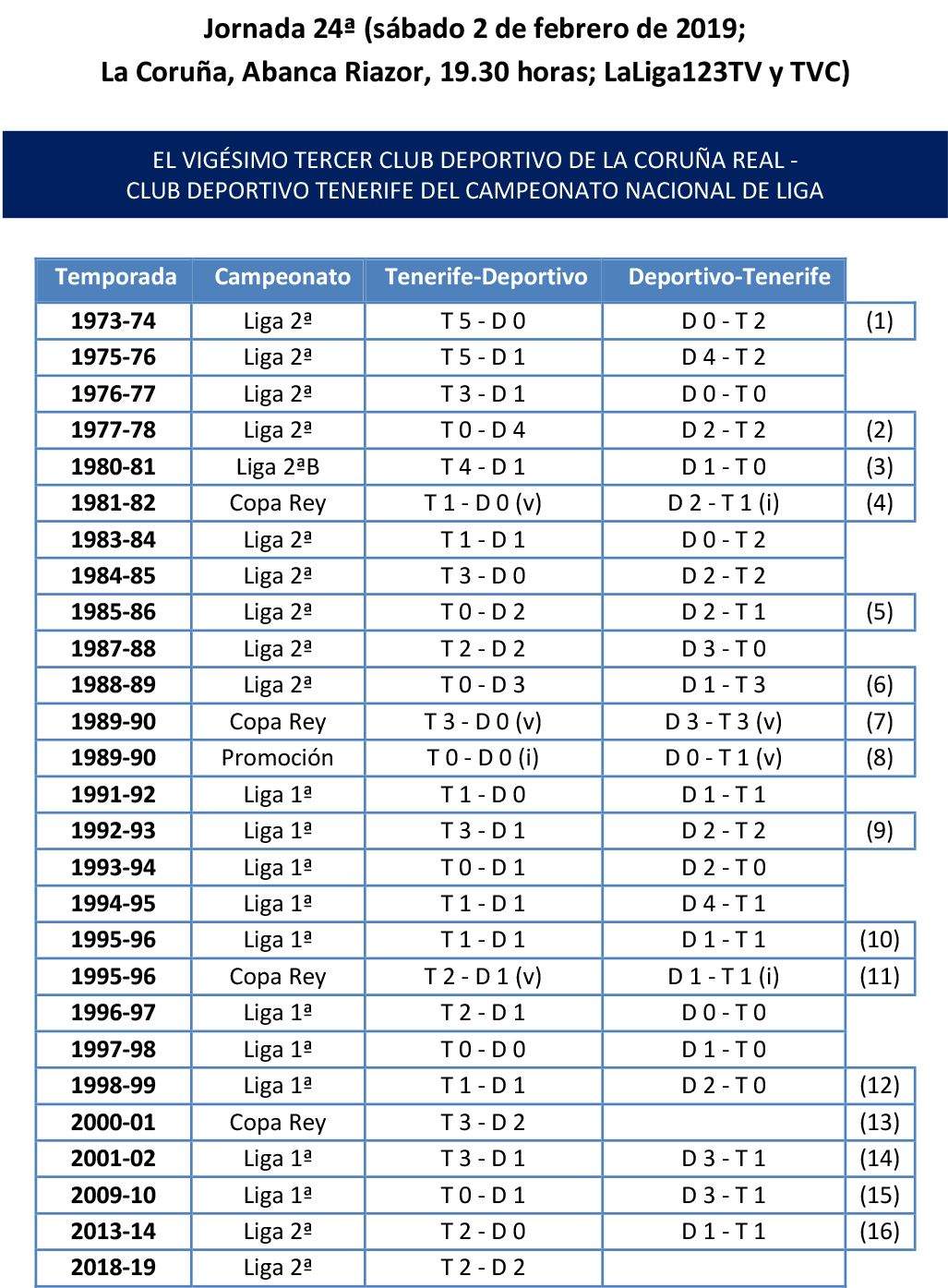 El CD Tenerife ganó por última vez en Riazor en la 1988-89 (1-3), y desde entonces ha podido arrancar varios empates, pero nunca un triunfo. En total suma cuatro triunfos en el feudo del Dépor, y un año más la tendencia seguirá siendo favorable al equipo herculino, con un total de diez victorias, cinco empates y cuatro derrotas, por cuatro victorias, nueve empates y once derrotas blanquiazules.