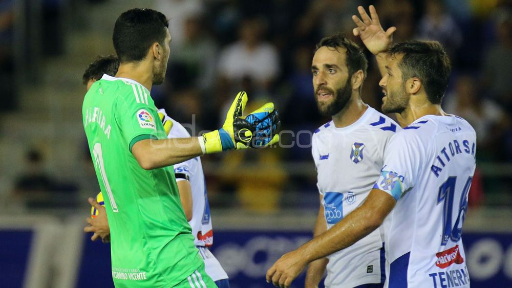 Carlos Ruiz discute con Sergio Herrera en el CD Tenerife-Osasuna | @jacfotografoEn total, han cosechado 25 puntos en El Sadar después de haber conseguido seis victorias, siete empates y haber caído derrotados en tres ocasiones (2-3 Alcorcón, 0-2 Nástic y 1-2 Zaragoza en la penúltima jornada).
