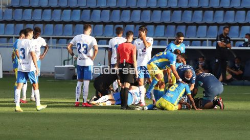 La peor noticia del derbi canario para el CD Tenerife no fue la derrota (1-3). Jacobo González sufrió un fuerte golpe en el tabique nasal en una jugada dividida con Maikel Mesa. El extremo tinerfeñista, que entró en la segunda parte, tuvo que abandonar el terreno de juego en camilla y con una toalla taponando la hemorragia que sufrió en la nariz.