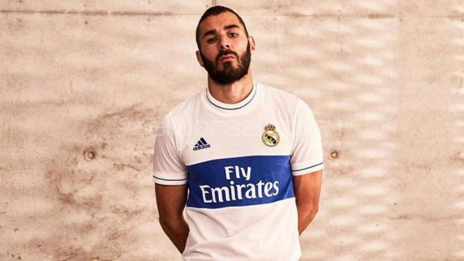 El Real Madrid ha lanzado una nueva camiseta con un toque 'vintage' utilizando a su delantero Karim Benzema como modelo. Una prenda blanca con franja azul que recuerda -y mucho- a la equipación del CD Tenerife en la temporada 2004-2005 (también las de la 03-04 y 05-06) cuando precisamente se enfrentó al conjunto merengue en Copa del Rey, con victoria madrileña por un gol a dos después de la prórroga.