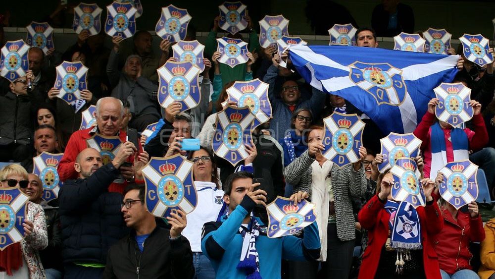 La afición del CD Tenerife muestra los escudos a la salida del equipo al campo | @JacfotografoEl 75% eligió la primera opción mientras que el 18% la segunda. Un 7% no ve capacitado al equipo de conseguir el primer triunfo y eligieron la derrota como resultado, algo que dejaría muy tocado a los blanquiazules.