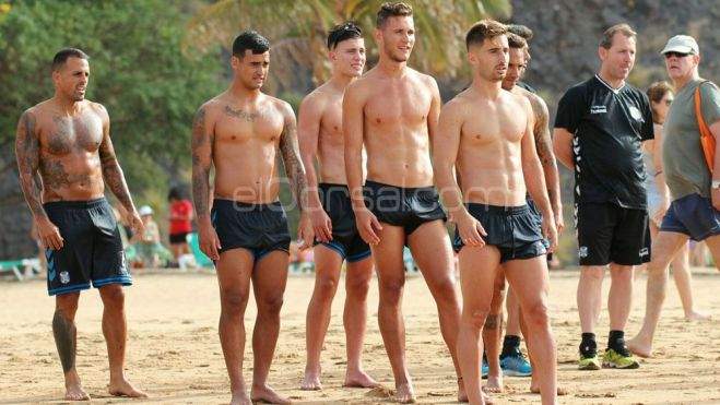 Cristo González y los compañeros del CD Tenerife entrenan en la playa de Las Teresitas. | @JacfotografoDani Hernández, Jorge Sáenz, Vitolo, Alberto Jiménez o Suso Santana siguen en el equipo y no parece que ninguno de ellos vaya a salir, a excepción de Jorge, que tiene ofertas de Primera División y –si las condiciones satisfacen tanto a club como a jugador- no habría problemas para que abandonara la entidad.