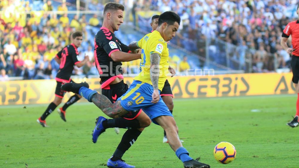 El equipo amarillo con el paso de los minutos comenzó a dar más sensación de peligro y en un partido donde los esfuerzos se acumulaban en el centro del campo, fue en una de las pocas acciones por fuera, por la banda derecha, cuando llegó el primer gol del derbi canario. Una gran jugada técnica de Fidel, acompañada por la debilidad defensiva de Camille, dio lugar a un pase perfecto para que Araujo hiciera el tanto local en el minuto diecisiete.