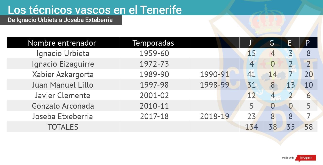 En todo caso, Etxeberria es el único que presenta un balance positivo entre victorias y derrotas, aunque eso no evitó que su periplo en la Isla se saldara con un suspenso, por lo que López Garai tiene el reto de poner fin a la maldición que persigue a los técnicos vascos en el Tenerife. Y es que los entrenadores forjados en Euskadi han sido capaces de triunfar en todo el mundo... menos en el Heliodoro.