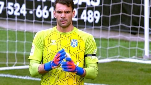 El portero del Tenerife vio la tarjeta amarilla mientras que desde el VAR instaron al colegiado a revisar el color de la cartulina. El Heliodoro contuvo la respiración durante unos minutos, pero el árbitro no cambió de parecer y decidió mantener la amarilla.