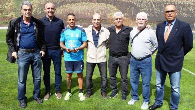 El presidente de la Asociación de Antiguos Jugadores del CD Tenerife (AJUTE) y actual consejero de la entidad blanquiazul, Juan Manuel Quintero, acompañado por diferentes miembros de su junta directiva, hizo entrega a Vitolo, en la sala de prensa de El Mundialito, del premio al futbolista blanquiazul más valioso de la pasada temporada. En su quinta edición, este reconocimiento recayó en el destacado centrocampista local.