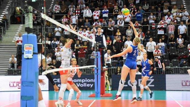 El Haris se soltó para centrarse en sus virtudes y el Lodz se vio sorprendido por una escuadra valiente y sólida en los fundamentos de defensa y, sobre todo, en bloqueo. El buen desempeño de las blanquiazules se tradujo en ventajas de dos o tres puntos per entonces el Lodz se remangó y volteó el tanteo con un parcial de 4-0. Tocaba mantener la calma y derrochar la osadía del tercer y, a la postre, último set. De este modo, Belly Nsunguimina remató un diagonal por cuatro para el 15-16. Las rojiblancas sufrieron para despegarse en el marcador, pero al final lo lograron para echar el cierre, en el set más apretado por 25-20.