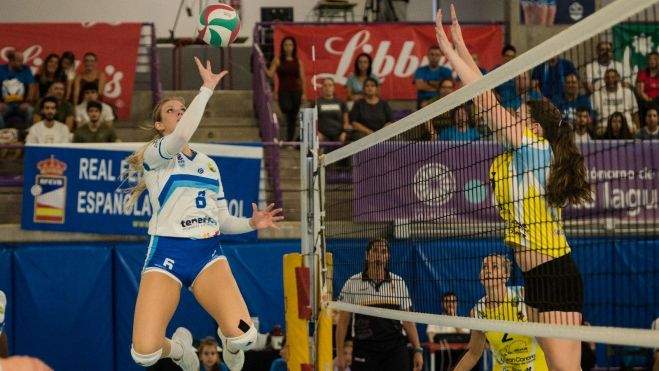 En el segundo set, Julie Lengweiler espoleó la reacción local por zona dos. Poco a poco el cuadro lagunero comenzó a enderezar el rumbo aunque las visitantes plantaron cara desde el saque, con una defensa solvente y un ataque agresivo. Aún así, con el empuje de la grada del recinto de San Matías, las tinerfeñas pudieron reponerse y empatar gracias a un remate materializado por Belly Nsunguimina, que irrumpió por zona cuatro para poner el ajustado 25-22.
