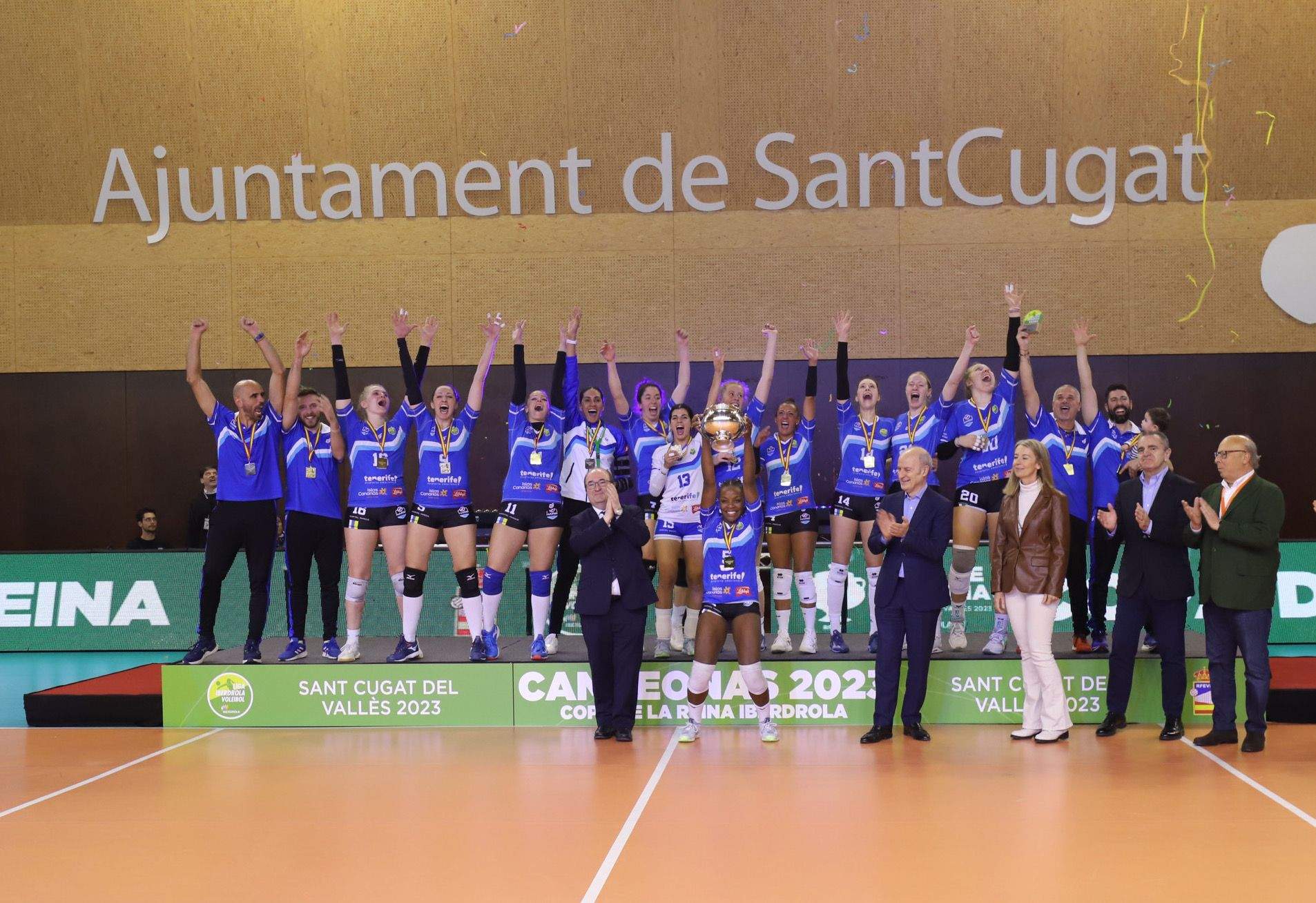 El CV Haris Tenerife revalidó su título de Copa de la Reina venciendo al Olímpico de Gran Canaria por 2-3 (22-25, 25-19, 25,16, 27-29, 13-15) en la final canaria disputada en Sant Cugat. Lideradas por una espléndida Belly Nsunguimina, MVP del partido, empezaron decididas y se adjudicaron la primera manga por 22-25. Pero el Olímpico reaccionó y tomó ventaja venciendo en los dos sets siguientes, por 25-19 y 25-16, dándole la vuelta al marcador. Aún así el Haris empató la contienda 2-2 en un apretadísimo cuarto episodio que terminó con 27-29 para las de Juan Diego García. El vuelco anímico llevó en volandas al cuadro tinerfeño hasta culminar la remontada por 13-15 en el 'tie-break' para conquistar, por tercera vez y segundo año consecutivo, la Copa de la Reina.