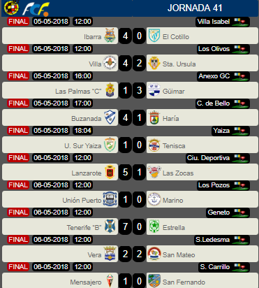 EL IBARRA, SIN OPCIONES DE PLAYOFFEl equipo de Patricio de Ara ya lo tenía muy complicado antes de disputarse la jornada. Se hallaba a cinco puntos del Lanzarote, con seis en juego, y el conjunto conejero no falló ante su afición, goleando a Las Zocas, que no se jugaba nada (5-1).