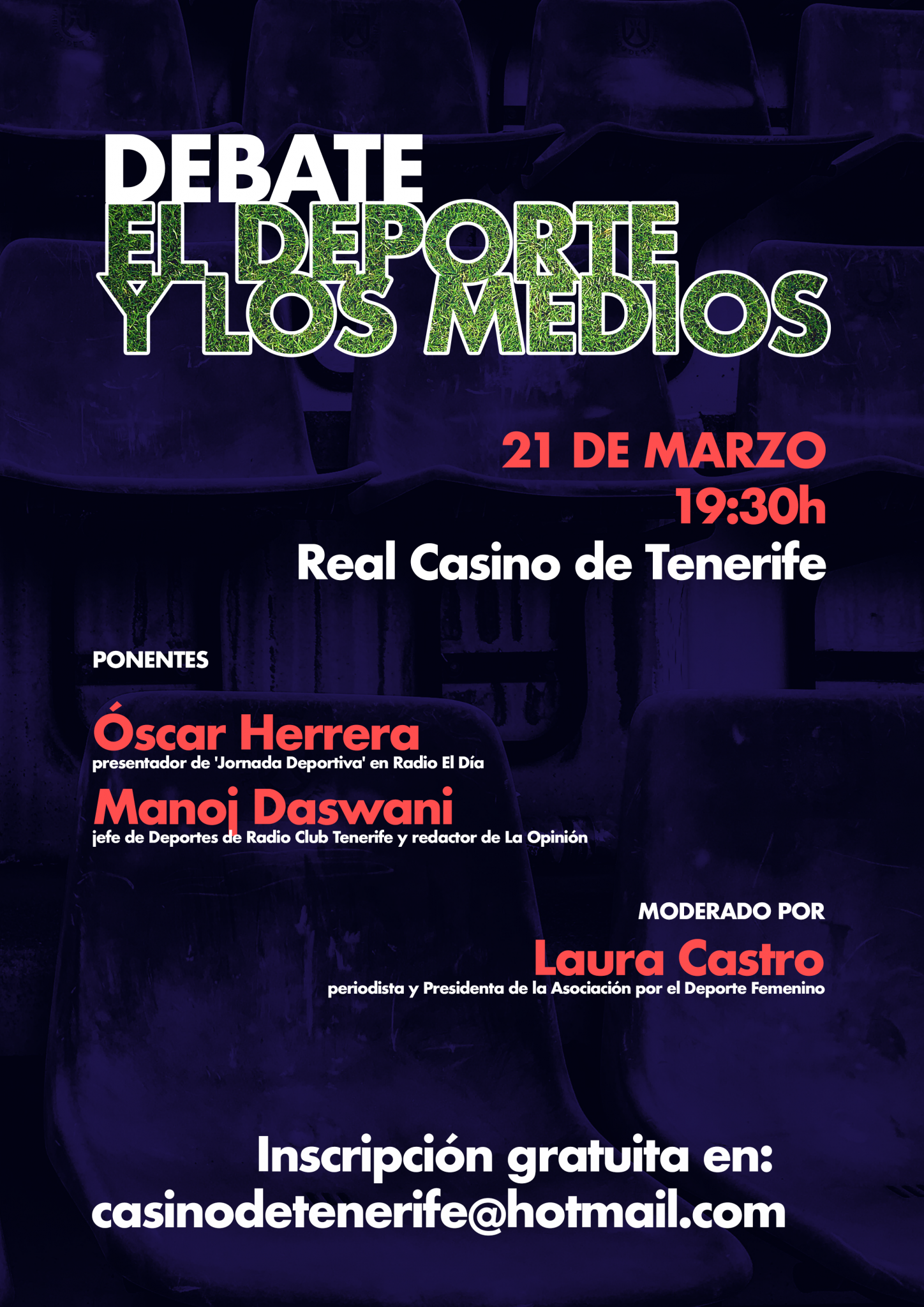 El 21 de marzo, debatirán en el Real Casino de Tenerife sobre el estado de los medios de comunicación y su relación con el deporte; la situación actual del CD Tenerife; el papel de la mujer en el deporte y la prensa; y otros muchos asuntos de actualidad. Asimismo, explicarán cómo componen diariamente sus respectivos espacios radiofónicos. Por último, se someterán a las preguntas de los asistentes al debate, que moderará Laura Castro, presidenta de la Asociación por el Deporte Femenino.