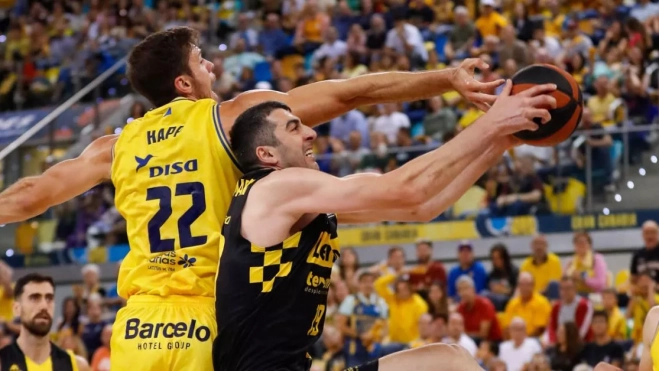 Canasta de Happ, triple de Brussino y nervios en las filas tinerfeñas. De pronto la ventaja era de tan solo seis puntos. Se repuso el Canarias por mediación de Marcelinho, finta y canastón, y luego fue Ristic quien sumó. De nuevo colchón de once puntos a falta de cinco minutos y medio. Brussino penetró y luego Happ castigó una pérdida inocente de Doornekamp.